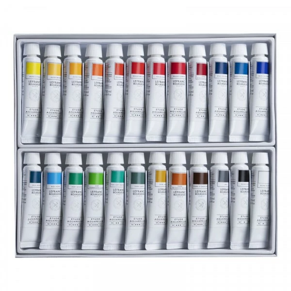 Description de 24 tubes de peinture aquarelle – Etude Studio – Lefranc Bourgeois – 10ml
