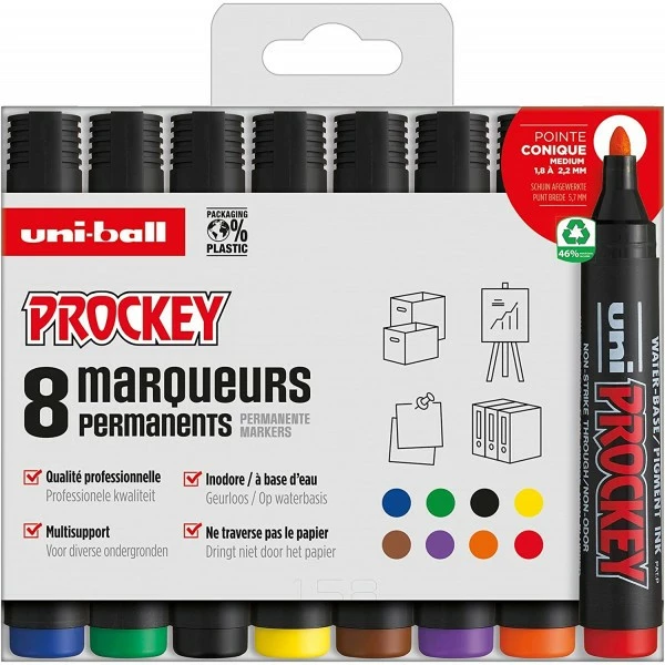 Description de 8 marqueurs permanents – Indélébile – Pointe conique – Assortis – Prockey – Uni-Ball