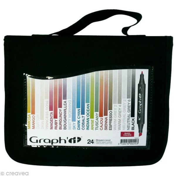 L’assortiment de marqueurs Graph’it Basic colors est composé de 24 feutres à alcool double pointe, idéals pour les dessinateurs, les srappeuses et les étudiants en Beaux-Arts. Comme le Copic ou le Promarker, les feutres Graph’it Basic colors vous faciliteront la colorisation de tous vos dessins. Cet assortiment vous est présenté dans une trousse de rangement très pratique pour la conservation de vos marqueurs.