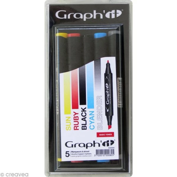 Assortiment de marqueurs Graph’it couleurs basiques composé de 5 feutres à alcool double pointe, parfaits pour les dessinateurs, les scrappeuses et les étudiants en Beaux-Arts. Comme le Copic ou le Promarker, les feutres Graph’it couleurs basiques vous faciliteront la colorisation de tous vos dessins. Vous trouverez dans ce kit Graph’it les couleurs suivantesnoir, transparent (blender), rouge rubis, jaune soleil et bleu cyan.