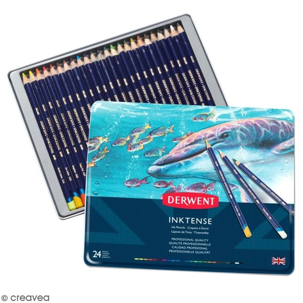 Voici 24 crayons de couleur Inktense dans une boîte en fer pour dessiner tout ce qui vous passe par la tête dans de belles couleurs intenses et couvrantes. Ces 24 crayons de couleur aquarellables Inktense sont des crayons de couleur à encre de haute qualité spécialement conçus pour tous les usages. Que vous soyez un professionnel,un étudiant en dessin ou un dessinateur chevronné, ces crayons de couleur sont faits pour vous !