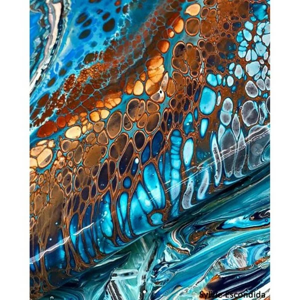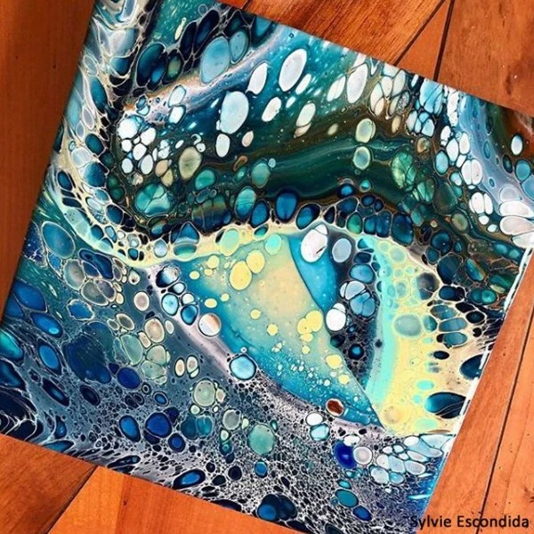 - Avant que la peinture ne sèche, vous pouvez encore déposer quelques gouttes de Magic Plop sur le châssis pour créer des cellules sur votre oeuvre