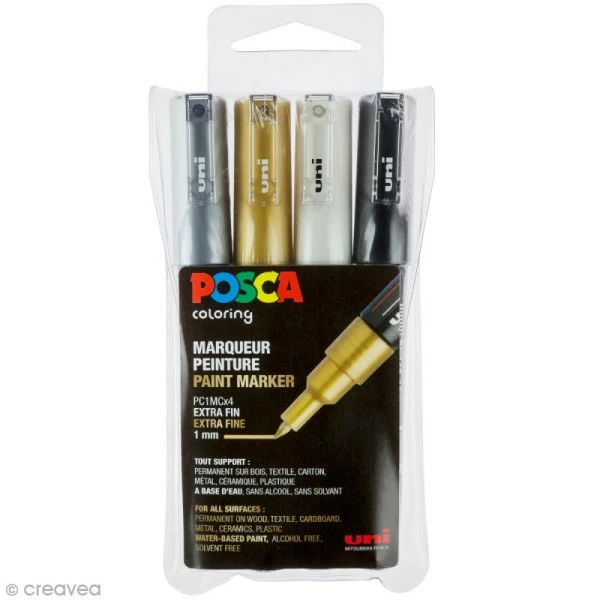 Le set de 4 marqueurs Posca Or, Argent, Noir & Blanc à pointe Calibrée extra fine de 1 mm sera parfait pour découvrir les Posca ! Le Posca pointe Calibrée extra fine sera idéal pour écrire, dessiner, peindre, décorer, colorer et marquer. Facile, ludique et mixte, le Posca à pointe Calibrée extra fine offre un tracé droit et dense. En quelques mots, le marqueur Posca petit format à pointe Calibrée extra fine est un marqueur peinture idéal pour les mises en couleur précises. Il sera très apprécié par les adultes confirmés ou débutants comme les enfants.