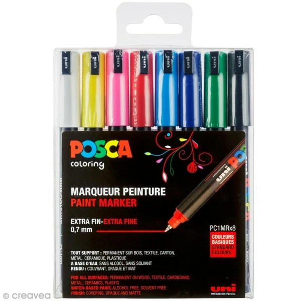 Le set de 8 marqueurs Posca Basiques à pointe Calibrée extra fine de 0,7 mm sera parfait pour découvrir les Posca ! Le Posca pointe Calibrée extra fine sera idéal pour écrire, dessiner, peindre, décorer et marquer. Précis et fiable, le Posca à pointe Calibrée extra fine offre un tracé très fin, dense et extrêmement précis. En quelques mots, le marqueur Posca à pointe Calibrée extra fine baguée métal est un marqueur peinture ultra précis sous forme de stylo. Il sera très apprécié par les graphistes, les amateurs de scrapbooking et les professionnels dessinateurs.