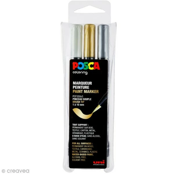 Le set de 3 marqueurs Posca Or, Argent & Blanc à pointe Pinceau de 1 à 10 mm sera parfait pour découvrir les Posca ! Le Posca pointe Pinceau sera idéal pour peindre, colorer, dessiner, décorer et calligraphier. Souple, fluide, pratique et polyvalent, le Posca à pointe Pinceau se glissera dans les moindres recoins de vos créations. En quelques mots, le marqueur Posca Brush à pointe Pinceau est comme un pinceau sans les inconvénients ! Il sera très apprécié par les artistes peintres comme les débutants et enfants.