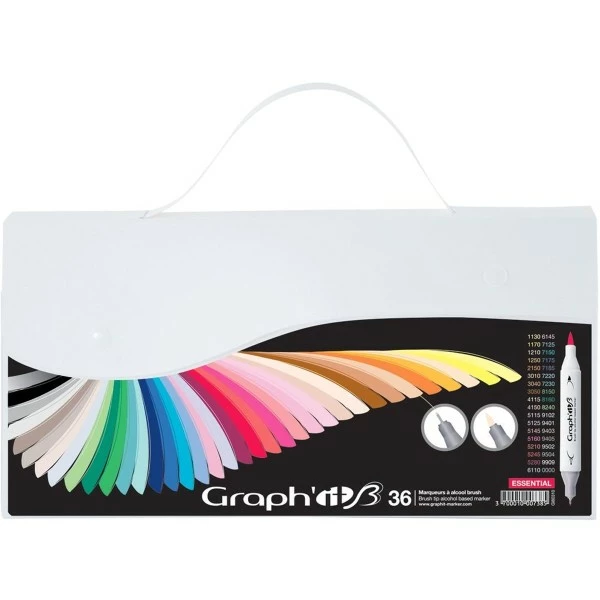 Ce set de marqueurs GRAPH’IT Brush & Extra fine Essential est composé de 36 feutres à alcool double pointe, idéals pour les dessinateurs, scrappeuses et les étudiants en Beaux-Arts. Cet assortiment est présenté dans un set de rangement très pratique pour la conservation et le transport de vos marqueurs.