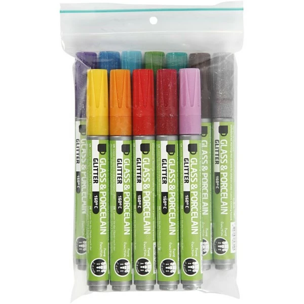 Grâce à ce set de 12 feutres de couleurs standards et pailletées vous pourrez décorez facilement des supports en verre, céramique, porcelaine ou même le métal.