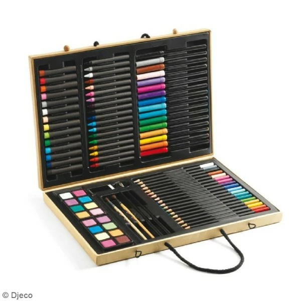 Avec cette jolie mallette de couleurs, les enfants seront sûrs de trouver tout le matériel nécessaire pour éveiller leur créativitécrayons de couleurs, de cire et de papier, feutres, pastels gras et d’aquarelle, pinceaux, taille-crayon, etc.