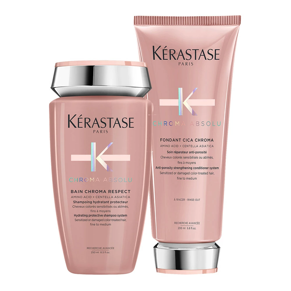 Duo Chroma Respect Chroma Absolu Kérastase composé d’un Bain Chroma Respect 250ml et d’un Fondant Cica Chroma 200ml, pour les cheveux colorés sensibilisés ou abîmés, fins à moyens.