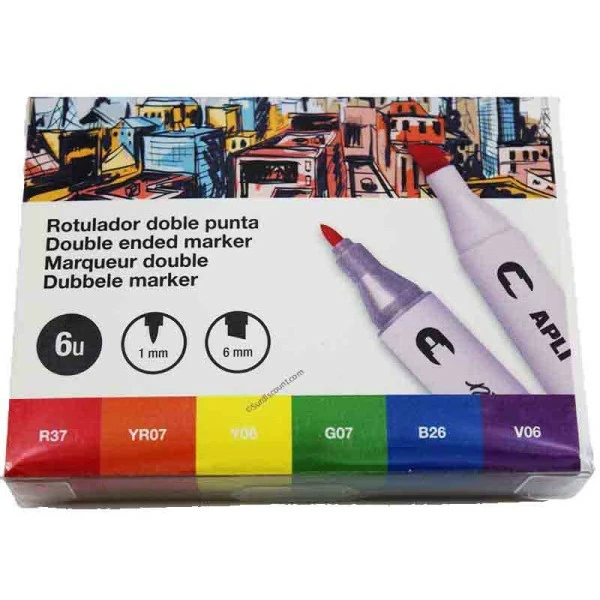 Les feutres 6 couleurs Apli 6U street market à double pointe, une de 1mm et une de 6mm sont idéales pour le dessin ou toutes autres conceptions graphiques.