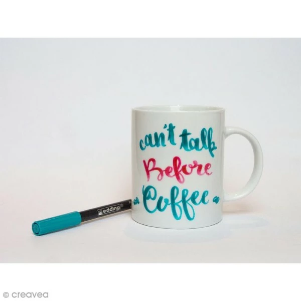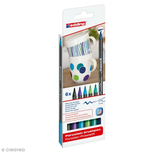 Utilisez ce set de feutres pour porcelaines (Camaïeu bleu vert) pour décorer joliment de la porcelaine, de la céramique émaillée, mais aussi du verre allant au four. La pointe pinceau de ces feutres (1-4 mm d’épaisseur) est flexible, ce qui permet à la fois des aplats larges comme des traits fins. L’encre épaisse de ces feutres Edding Camaïeu bleu vert vous permettra d’obtenir un rendu uniforme de la couleur. De plus, l’encre ne fait ni coulures, ni gouttes et ne s’étale pas. De quoi faciliter tous vos travaux !