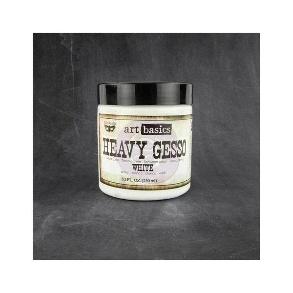 Gesso white Finnabair arts basics heavy Le Gesso est à base d’eau, il est opaque et mat. Il s’applique au pinceau ou à la spatule. Il sèche rapidement, le séchage peut être accéléré au sèche cheveux ou au pistolet chauffant. Une fois sec le Gesso est flexible.
