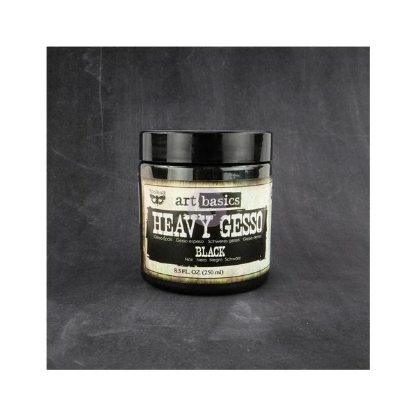 Gesso black Finnabair arts basics heavy Le Gesso est à base d’eau, il est opaque et mat. Il s’applique au pinceau ou à la spatule. Il sèche rapidement, le séchage peut être accéléré au sèche cheveux ou au pistolet chauffant. Une fois sec le Gesso est flexible.
