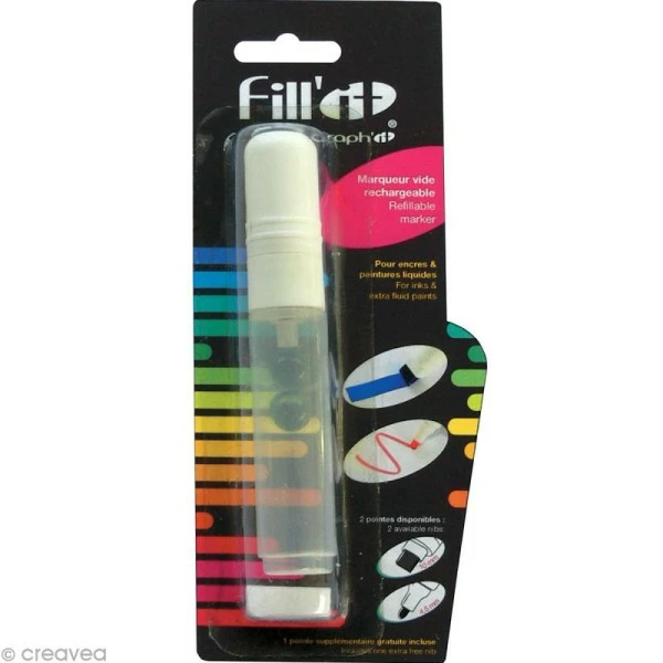 Marqueur vide rechargeable avec pointe large 10 mm + 1 pointe de rechange. Il contient 2 billes pour activer le mélange de liquide et est spécialement conçu pour les encres et peintures extra fluides comme l’encre à alcool, l’encre acrylique, l’encre de chine ou la peinture sur soie. Vous pourrez ainsi créer vos propres mélanges !