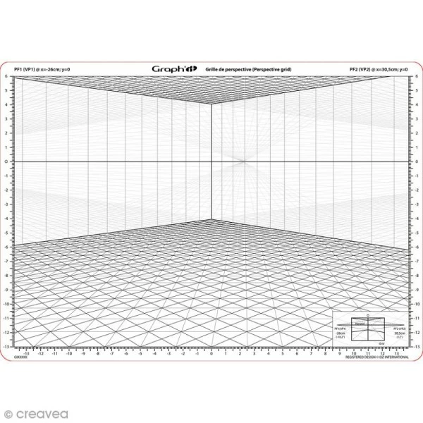Cette grille de perspective multi-usages Graph’it au format A4 est imprimée sur du plastique souple pour intégrer dans une perspective personnages ou objets. Gagnez du temps et conservez la bonne perspective grâce à cette grille Graph’it A. Elle sera parfaite pour vous accompagner dans vos projets de dessinsdessin technique, illustration ou bandes dessinées par exemple. En effet, vous trouverez les coordonnées des points de fuites, les axes gradués et le schéma de l’emplacement de la grille dans la perspective ce qui vous permettra de poursuivre facilement la perspective au-delà du cadre de la grille.