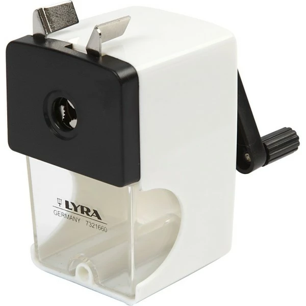 Taille-crayon manuel logé dans une boîte en plastique – pour crayons classiques et plus gros.