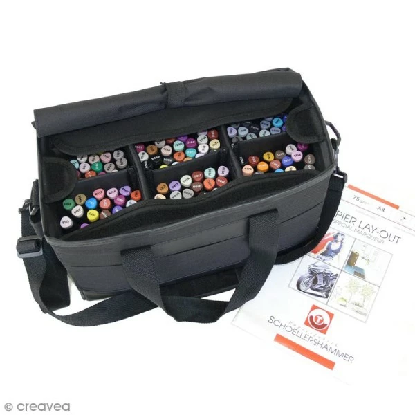 Cette grande mallette Graph’it sera parfaite pour ranger et transporter vos feutres à alcool. Toute la gamme est inclue (soit 165 marqueurs), ainsi qu’un bloc de papier layout A4. Différents compartiments vous permettront de classer les couleurs et un emplacement est prévu sur le côté pour ranger le bloc de papier dessin au format A4. Ses dimensions sont de 35,5 x 17 x 22,5 cm.