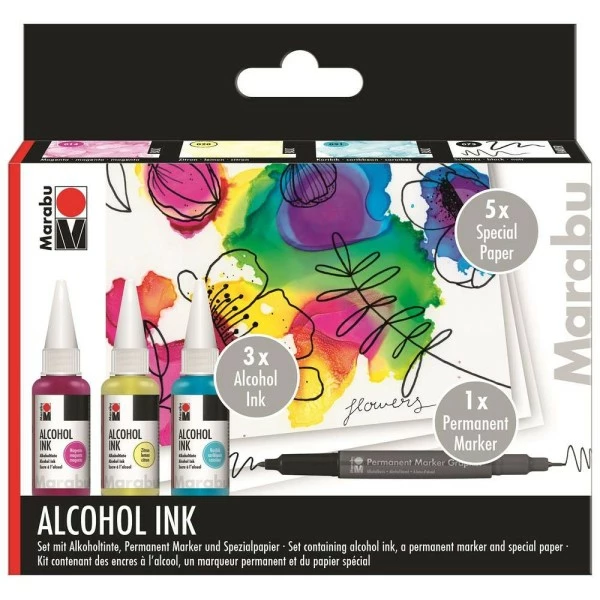 - contenu3x Alcohol Ink de 20 ml (magenta, citron, caraïbe), 1x marqueur permanent (noir), 5x papier spéciaux A6, 1x brochure A5