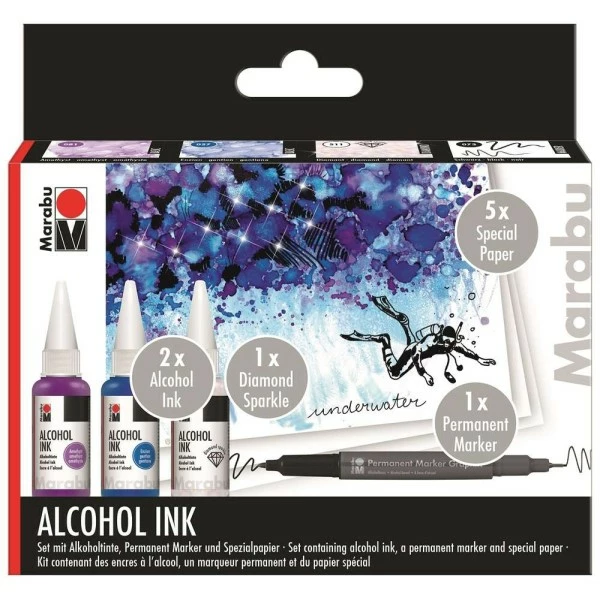 - contenu3x Alcohol Ink de 20 ml (gentiane, améthyste, diamant), 1x marqueur permanent (noir), 5x papier spéciaux A6, 1x brochure A5