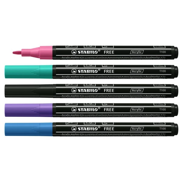 Découvrez la dernière nouveauté de Stabilo : le feutre acrylique Stabilo Free T100, un marqueur peinture pointe fine pour dessiner, colorier, personnaliser sans limites sur presque toutes les surfaces !