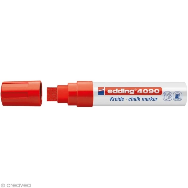 Marqueur craie 4090 Rouge de la marque Edding pour écrire et décorer vos fenêtres et ardoises. Ce feutre craie liquide Rouge est à base d’eau, s’efface avec un chiffon humide sur presque toutes les surfaces poreuses ou non. Le marqueur craie 4090 Edding convient aussi pour écrire sur les tableaux noirs. Il est donc parfait si vos enfants ont un tableau dans leur chambre. Sa pointe biseautée permettra des traits de 4 à 15 mm.