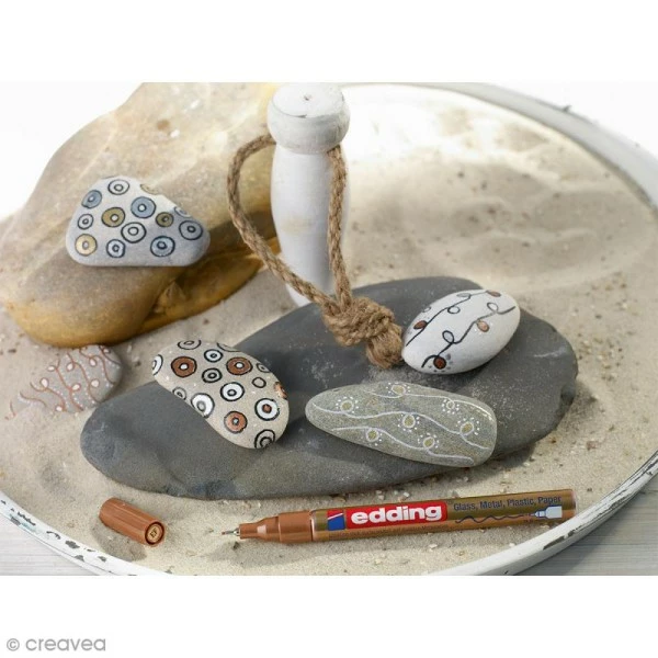 Conseils : Appliquez le feutre Edding 780 Argenté d’abord sur une feuille de papier, et non directement sur l’objet à peindre, car l’activation du système de valve du marqueur peut parfois engendrer la sortie d’un surplus de peinture.