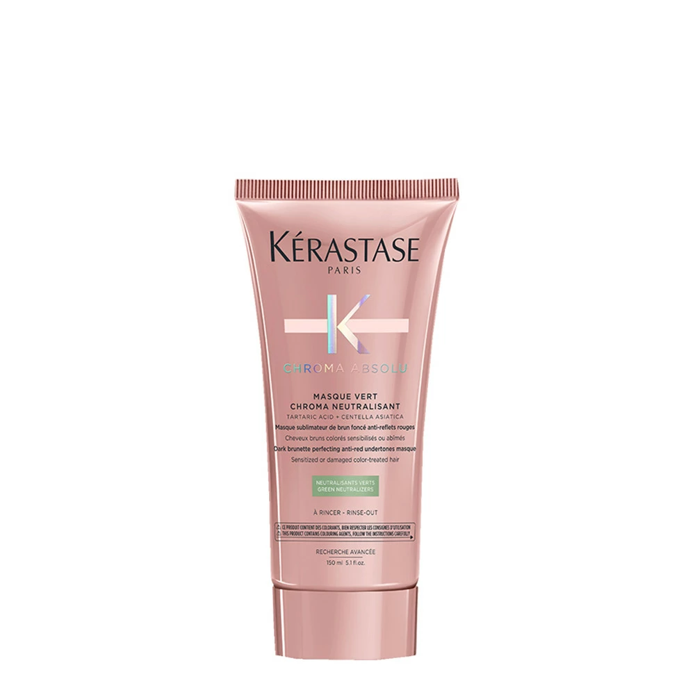 Masque Vert Chroma Neutralisant Chroma Absolu Kérastase : masque sublimateur de brun foncé anti-reflets rouges pour cheveux bruns colorés sensibilisés ou abîmés.