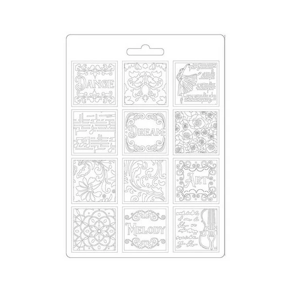 Soft Mould Stamperia A5 Passion patchwork music Ces moules de haute définition, feront des décors très précis. Une fois le décor démoulé, vous pourrez le peindre à votre guise. Différentes techniques et produits peuvent être mis sur ce moulage. Cire, peinture, gesso, etc…