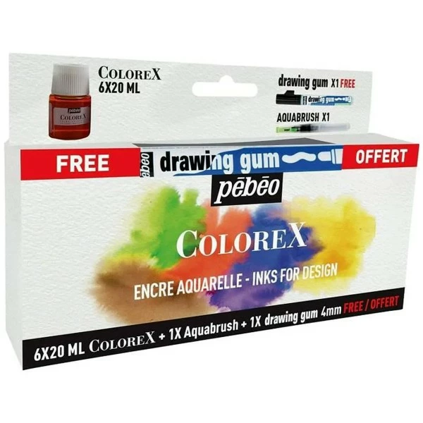 Découvrez ce coffret Pébéo Colorex contenant 6 flacons de 20 ml ainsi qu’un pinceau à réservoir et un marqueur Drawing gum 4 mm. L’encre Pébéo Colorex est l’encre aquarelle de référence pour tous les artistes.