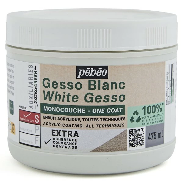 Le Gesso Pébéo Studio Green Blanc Monocouche (appelé également médium, auxiliaire ou apprêt), est un enduit acrylique vous permettant de préparer vos supports à peindre en renforçant l’accroche de la peinture. Extra couvrant et adhérent en une seule couche, il s’applique sur une surface propre et non grasse.