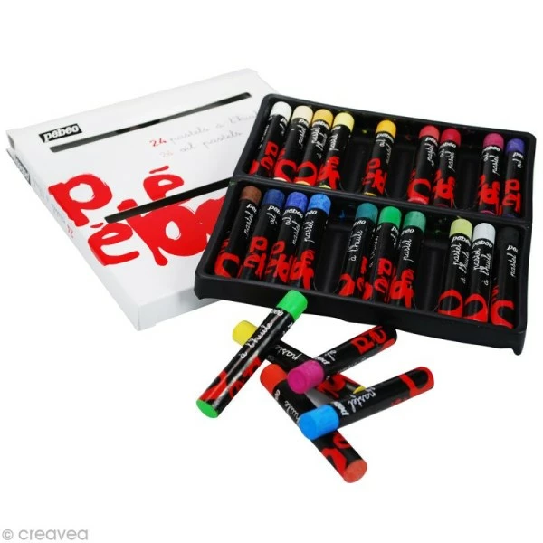 Assortiment de 24 Pastels gras par Pébéo. Ce lot de 24 pastels à l’huile de couleurs différentes sera apprécié pour sa très grande qualité ainsi que sa résistance. Très tendres, les pastels gras de Pébéo pourront être utilisées sur du papier ou de la toile. Vous pourrez utiliser vos pastels gras Pébéo seuls ou dilués à l’essence de térébenthine.