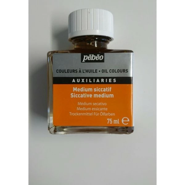 Le médium siccatif diminue le temps de séchage des couleurs à l’huile, dont il réduit la consistance. Utilisé en quantité minimale, il garantit également la flexibilité et la durabilité du film de peinture. Il se dilue avec de l’essence de pétrole.