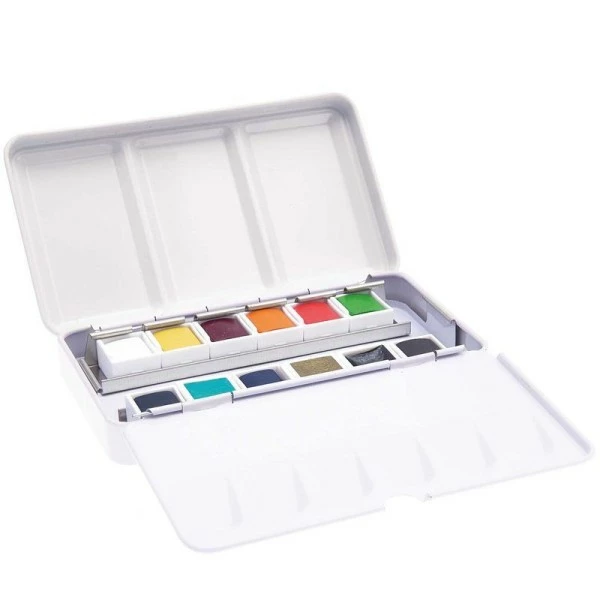 La palette de Rico Design aux couleurs arc-en-ciel contient 12 couleurs dans des 1/2 godets, le tout dans une boîte en métal facilement transportable. Les couleurs sont vives et certaines couleurs sont métalliques et fluos. Elle devient un objet indispensable dans le matériel des débutants comme des experts en aquarelle.