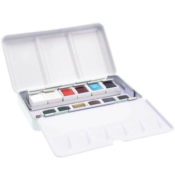La palette de Rico Design est indispensable dans vos fournitures de peinture. Elle contient 12 couleurs froides dans des 1/2 godets, dans une boîte en métal facilement transportable. Les couleurs sont froides et deux couleurs ont un effet métallique doré et argenté. Les peintures sont faciles d’utilisation, la palette convient aux débutants comme aux experts.