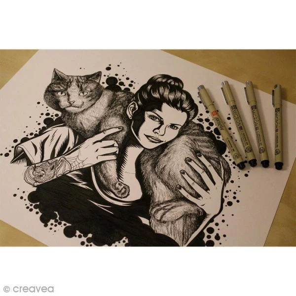 Ces marqueurs calibrés Pigma Micron possèdent une belle encre noire permanente pigmentée à base d’eau.