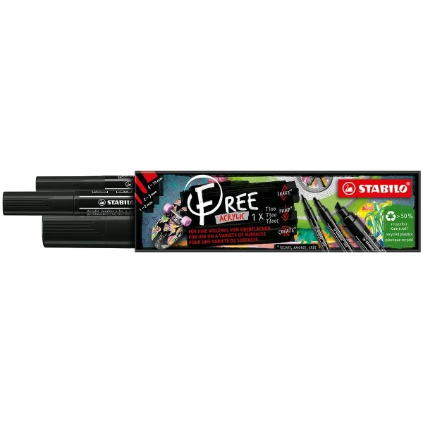 Description de Set de marqueurs acryliques Stabilo Free – Pointes mixtes – Noir – 3 pcs