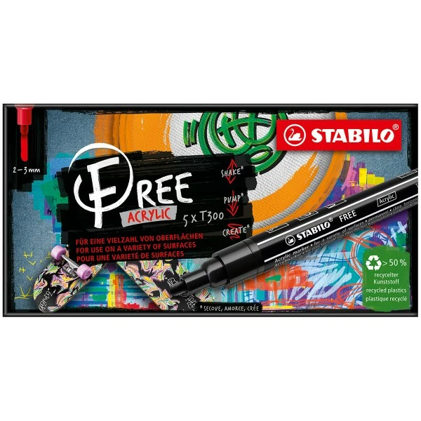 Les marqueurs acrylique Stabilo Free existent aussi en pointe moyenne (T300) et large biseautée (T800C)