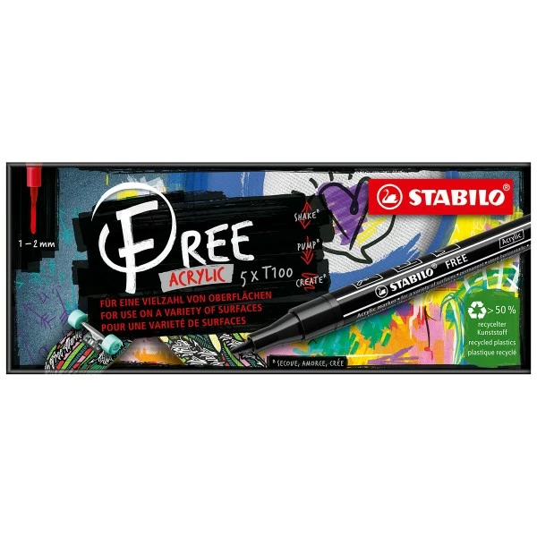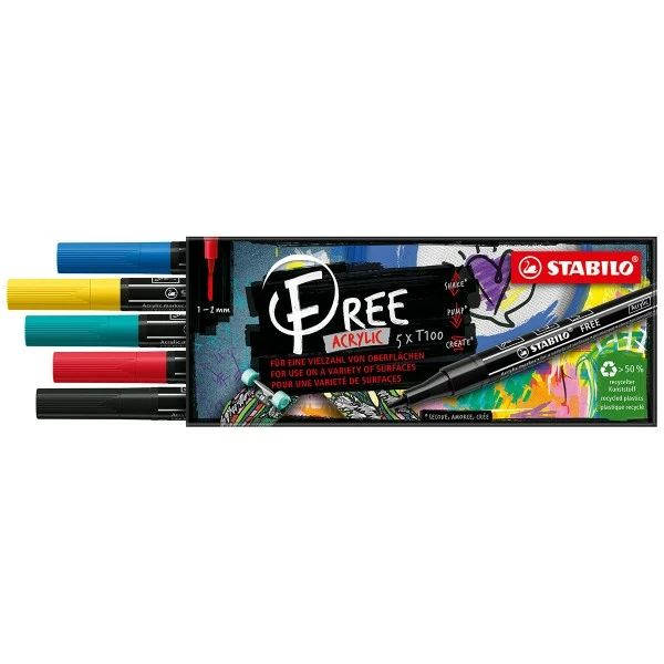 Découvrez la dernière nouveauté de Stabilo : le feutre acrylique Stabilo Free T100, un marqueur peinture pointe fine pour dessiner, colorier, personnaliser sans limites sur presque toutes les surfaces !
