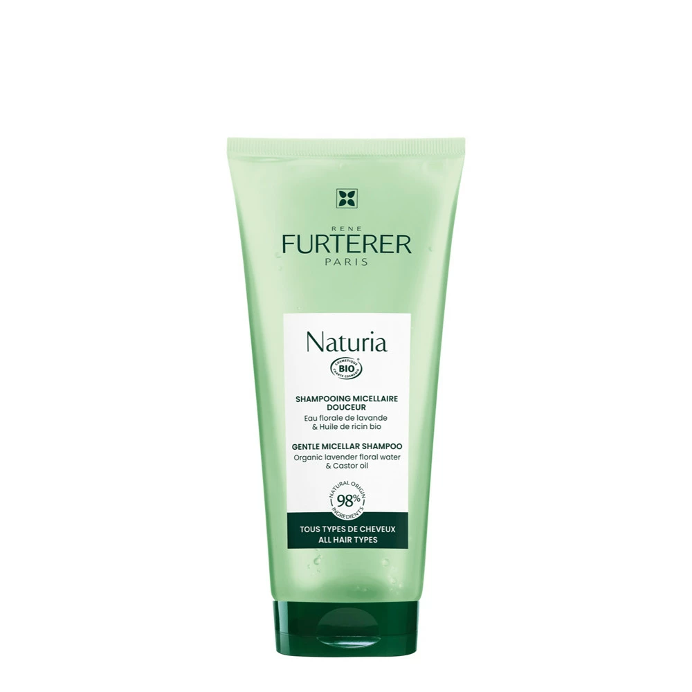 Shampooing Naturia Bio René Furterer 200ml : shampooing micellaire douceur pour tous les types de cheveux. À l’eau florale de lavande et à l’huile de ricin bio.