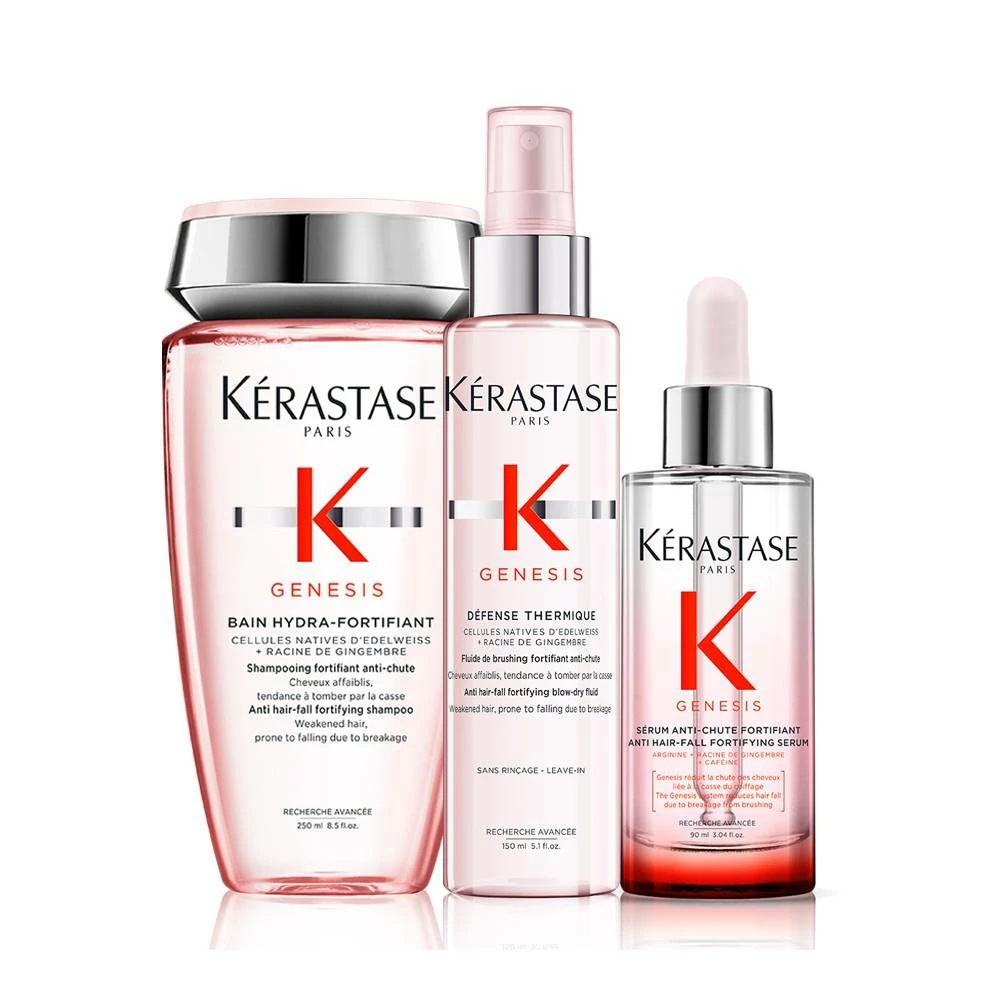 Trio anti-chute Genesis Kérastase pour cheveux fins : Bain Hydra-Fortifiant 250ml, Défense Thermique 150ml, Sérum Anti-Chute Fortifiant 90ml.