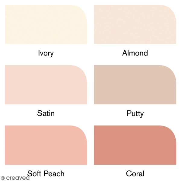 - Couleurs Tons de peauIvoire Y418, Amande O819, Satin Y129, Mastic O618, Pêche douce O138, Corail R937